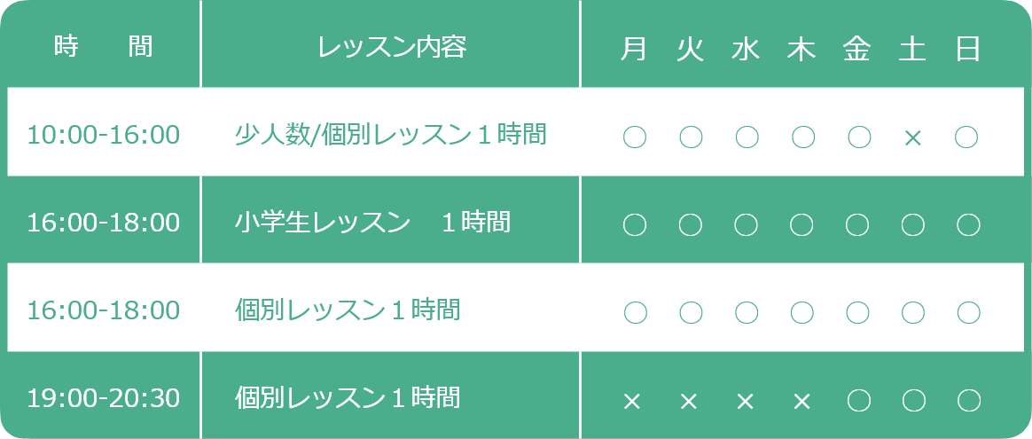 | 月謝 | 小学生(2年&3年) レッスン(45分) 8,000円〜/週1回の月4回 小学生4年〜6年 レッスン(1h) 10,000円/週1回の月4回 中・高校生・大学生 個別レッスン(1h) 15,000円/週1回の月4回 |